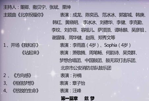 腾讯娱乐讯(ZHU/文)今天(27日)晚上,央视一套将播出大型歌会——《北京祝福你奥运梦想盛典》,可谓是群星荟萃。另外,其节目单也被曝光了。